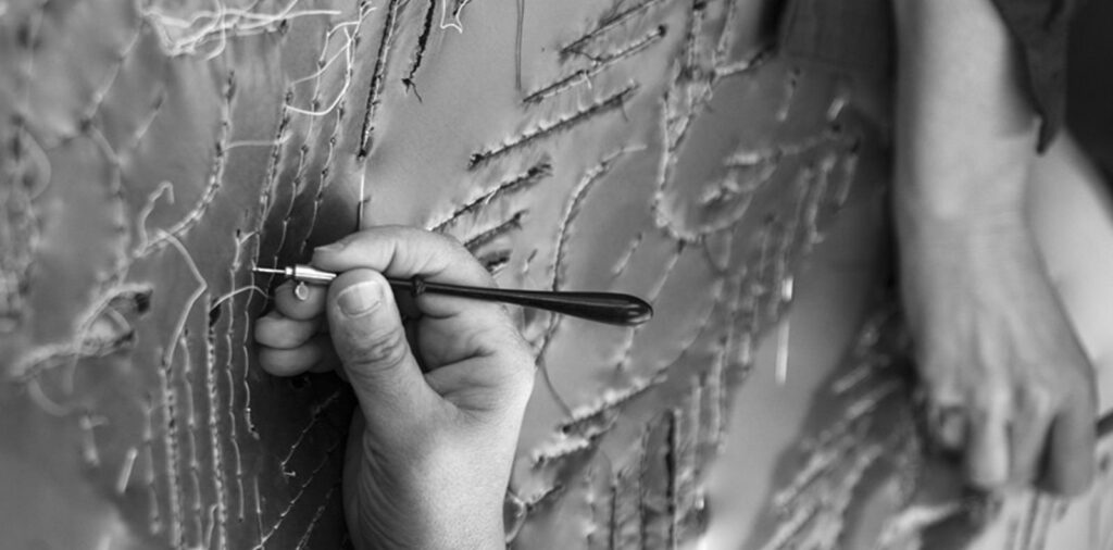 Diplômée de broderie d’art, j’intègre en juin 1979 la plus grande maison de broderie haute couture de Paris : LESAGE. Ma passion et mon sérieux me conduisent à devenir 1ère d’atelier dès 1985.